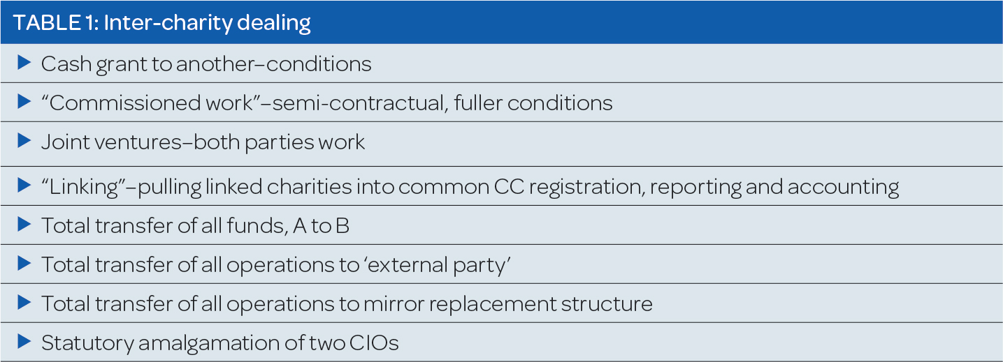 Charities work with each other. Government presses for greater efficiencies in the voluntary sector (eg, the Charities Act 2011 (CA 2011), s 14(4) ‘promote … effective use’). Structures need modernisation. So how do conflicts, property and indemnity inhibit common or desirable inter-charity dealings? See Table 1 for the types of transactions which concern us.